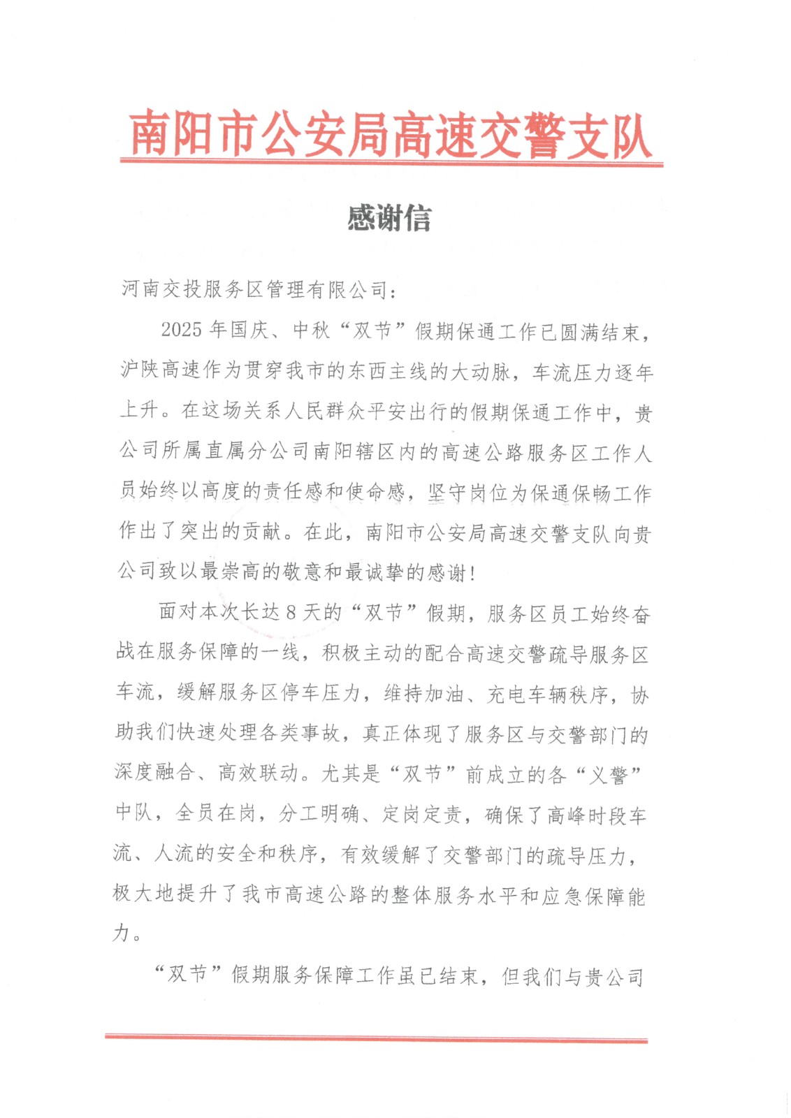 《一天內(nèi)連收兩封感謝信…》 “雙節(jié)”期間,面對假期車流人流驟增,公司所屬服務(wù)區(qū)科學部署、積極應(yīng)對,圓滿完成安全…